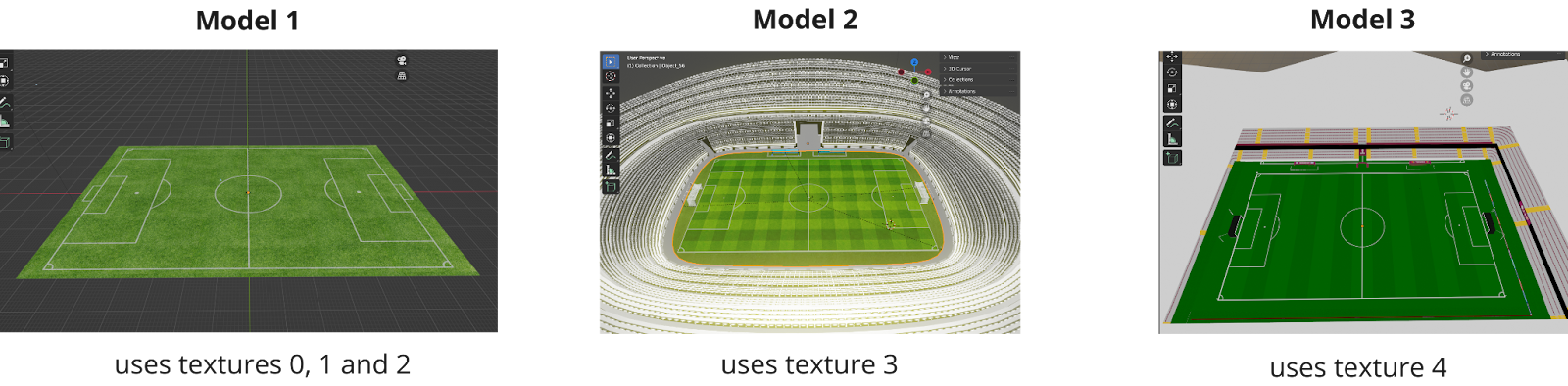 Synthetic Football images were obtained using Blender, a robust open-source 3D creation software widely used for modeling, animation, and rendering. Several football field models and textures have been used to extract various scenes from several internet sources.