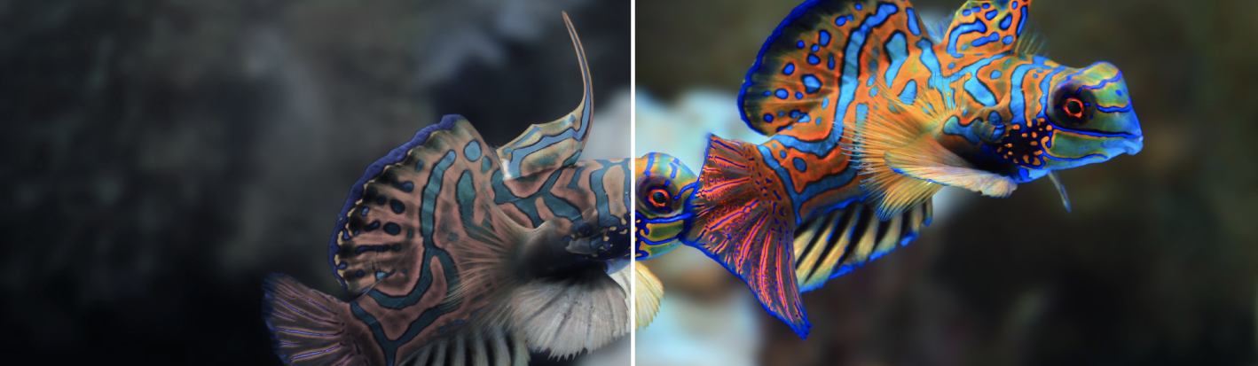 Our AI models are trained on a wide range of simulated and real underwater datasets, enabling precise estimation of color values based on pixel depth, ambient lighting conditions, and water type. This ensures that reds, yellows, and other wavelengths diminished at depth are accurately reconstructed.